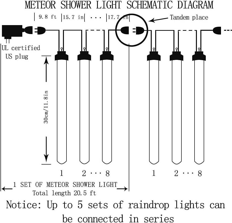 HIGH QUALITY & ENERGY EFFICIENT - The Meteor Shower LED Lights is Waterproof, dust proof; transparent PC material, corrosion resistant, cost resistant, aging resistant, more durable; Also The Falling Raindrop lights is free from time and space constraints, low power consumption and energy saving. It can be used as one or be connected (as many as five string lights).